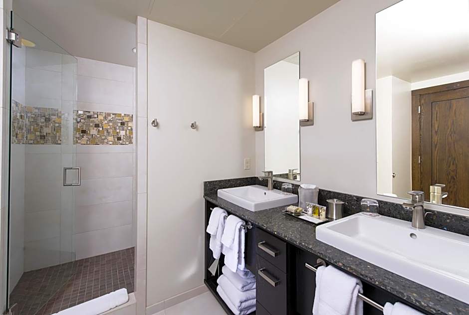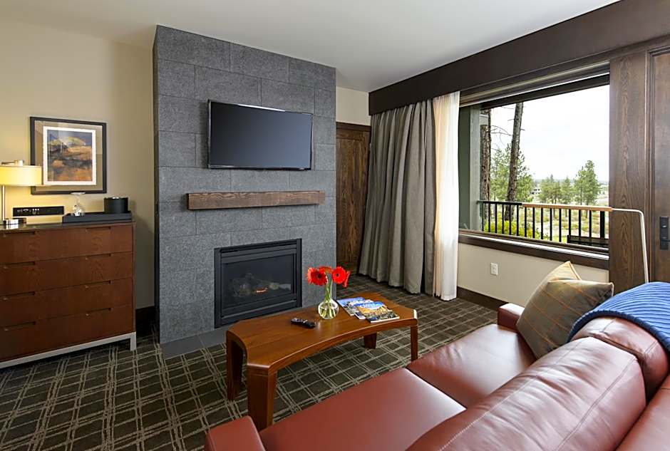 This southern-facing suite has a sofa bed, gas fireplace, and a separate living area. Views from this room are limited and overlook parking areas and vacation homes.