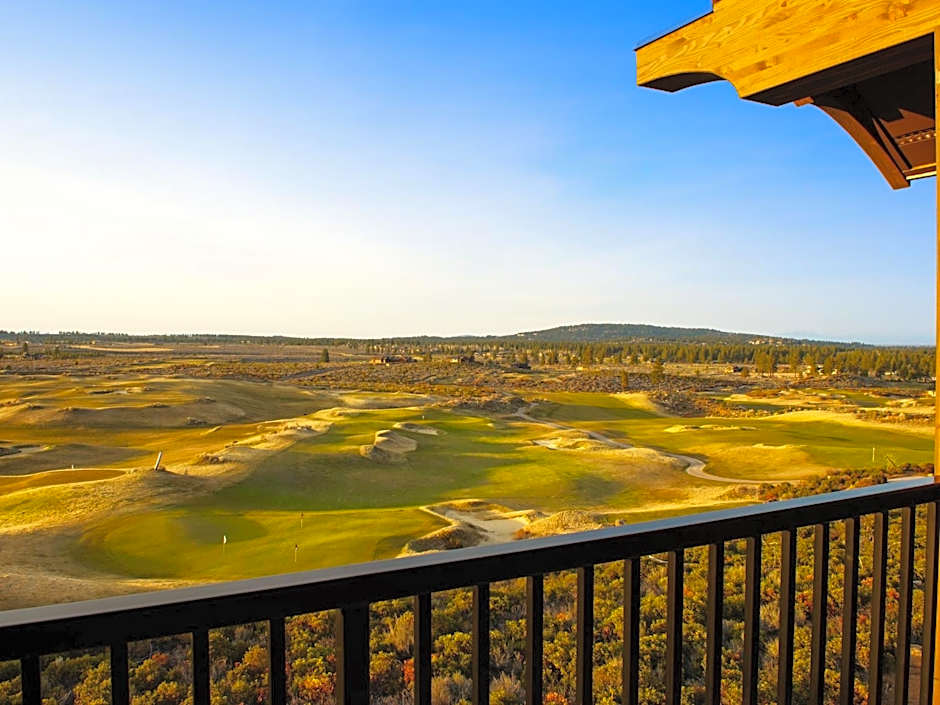 This king room has a seating area, wet bar, and cable TV. It features a gas fireplace and a balcony with a view of the golf course and Cascade range.