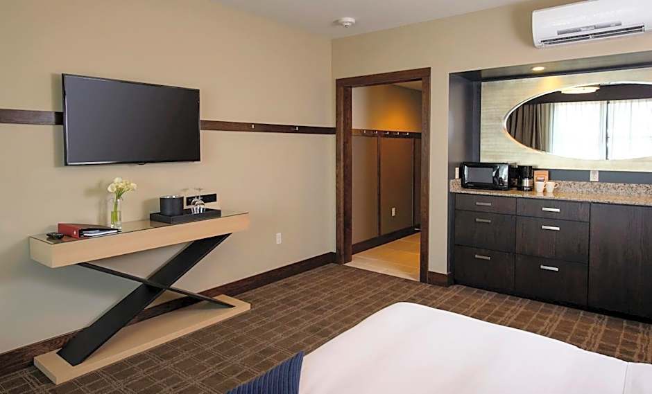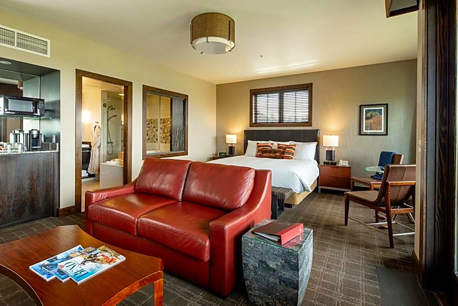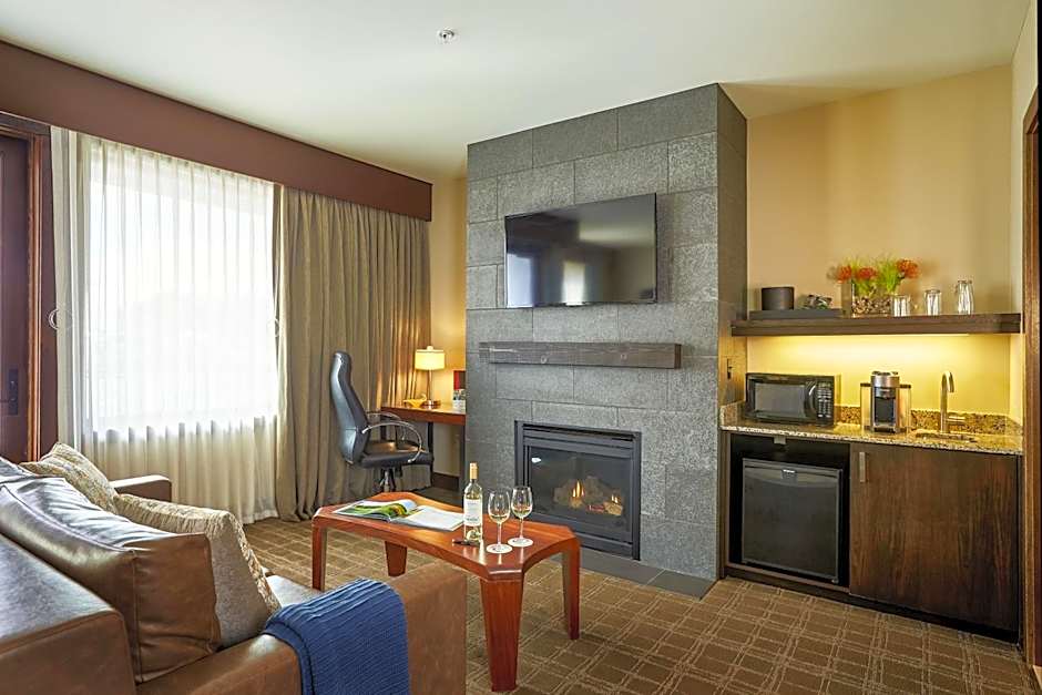 This king room has a seating area, wet bar, and cable TV. It features a gas fireplace and a balcony with a view to the south. Views from this room are limited and overlook parking areas and vacation homes.